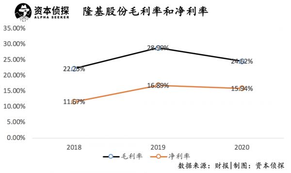 在毛利表现方面,隆基股份2020年的毛利率为24.62%,相比2019年减少4.28个百分点。细分来看,电站建设及服务毛利率为35.66%,下降幅度最大,达到9.13个百分点。不过因为这一业务营收只占总营收的2.4%,所以对总体毛利率影响不大。