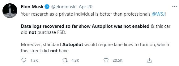 事故发生前不久,特斯拉 CEO 马斯克刚刚在 Twitter 上发布过公司新统计的数据,显示 Autopilot 功能的事故率是其它所有车辆的十分之一。事发后,马斯克回帖网友的推文,表示目前从车辆中收集到的数据显示,事故发生时 Autopilot 功能并未启动,该车辆未购买 FSD 高级自动驾驶功能升级包。