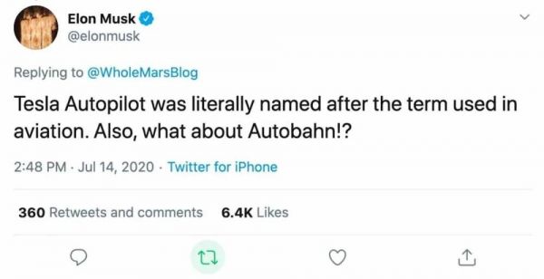 马斯克对此的回应绵软无力:“我们 Autopilot 的命名方式是从航空领域(飞机的辅助巡航功能)来的,德国的高速路不也叫 Autobahn 嘛。”