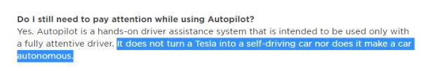 而特斯拉确实有告知用户,即使开启了 Autopilot 功能,驾驶员也仍需保持注意力——意味着 Autopilot 未达到 L3 水平,不属于自动驾驶。