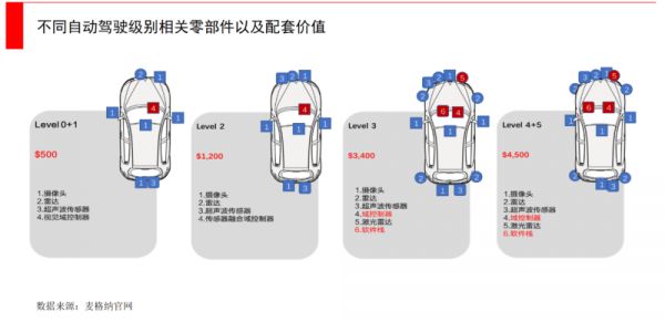 第四个原因就是汽车智能化本身带来的芯片需求暴涨。以车载摄像头为例,L2平均需要配备3~4颗摄像头,但随着智能驾驶等级提升,L2至L3平均需要配置7~8颗摄像头;L4就要配置10~15颗;L5则有可能要15颗以上。