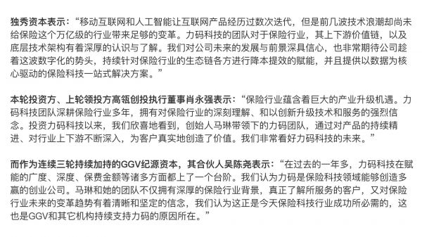 据悉,本轮融资后,公司将继续加大研发投入,同时进一步完善运营和市场等团队的建设,完善客户服务体验;长期来看,公司将立足客户需求,持续迭代产业链关键节点的技术,为广大客户提供更加全面、优质的“互联网保险+”解决方案。