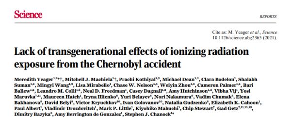 [1] Meredith Yeager et al., (2021), Lack of transgenerational effects of ionizing radiation exposure from the Chernobyl accident, Science, DOI: 10.1126/science.abg2365