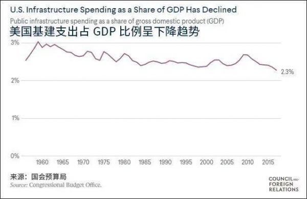 数十年来,美国政府在基础设施方面的投入一直不足,欠账太多。据美国土木工程师协会(ASCE)统计,2019年美国在基础设施上的支出仅占国内生产总值的2.5%,远低于二十世纪三十年代4.2%的投入水平。