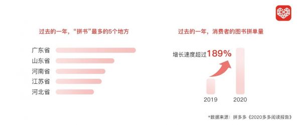 自2014年起,“全民阅读”连续八次被写入政府工作报告。2021年政府工作报告指出,要推进城乡公共文化服务体系一体建设,创新实施文化惠民工程,倡导全民阅读。在拼多多平台上,全民阅读也逐渐成为新消费群体的习惯。某种程度上,在地域分布上,广东、山东、河南、江苏和河北,成为“拼书”最多的地方,这也与各地庞大的人口基数有着密不可分的关系。
