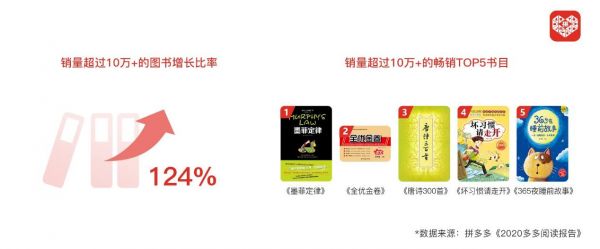 学习教辅、工具百科、科学技术和小说文学,已经成为最受拼多多读者欢迎的图书;文学小说书目订单中,95后、00后占比超4成;2020年,超过4亿人次的消费者在平台“拼书”,他们“拼”回家的知识,超过11个国家图书馆的藏书。