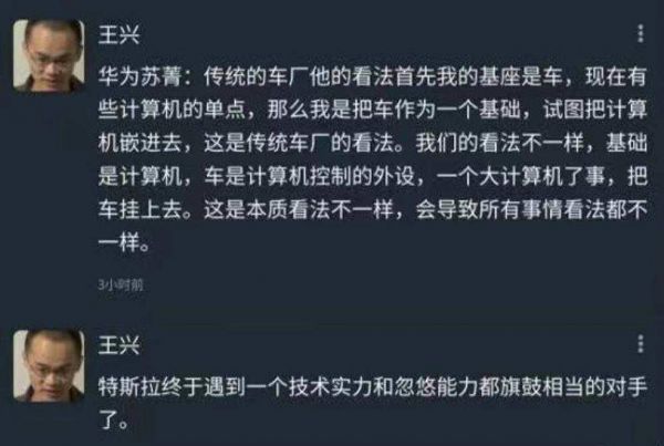 在第二波造车赛道上,除了百度,华为是另一个相对被看好的竞赛者。但华为的态度有所不同,这也招来了王兴语带讥讽地说“特斯拉终于遇到一个技术实力和忽悠能力旗鼓相当的对手了”。