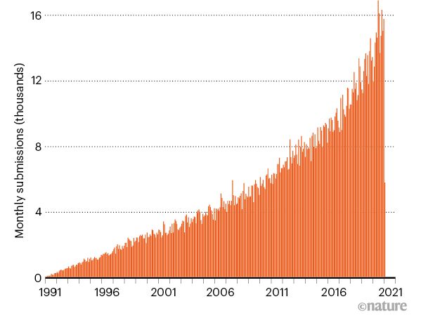 从1991年到2021年,arXiv每月吸引提交的预印本数量持续增长。| arXiv.org