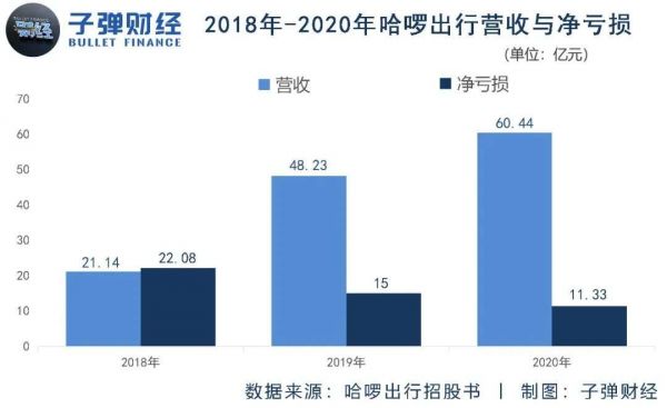 哈啰出行招股书显示,哈啰出行2018年、2019年、2020年营收分别为21.14亿元、48.23亿元、60.44亿元,三年净亏损分别为22.08亿元、15亿元、11.33亿元,三年合计亏损48.47亿元。总体而言,哈啰出行的营收持续扩大,净亏损在持续缩小。