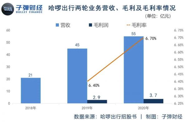 从盈利情况看,2018-2020年,哈啰共享两轮业务营收分别为21亿元、45亿元和55亿元。2019-2020年,哈啰出行的共享两轮业务毛利分别为2.9亿元和3.7亿元,毛利率分别为6.4%和6.7%。