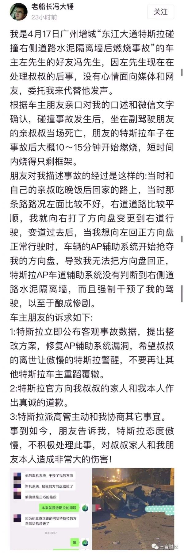 三言财经消息,日前广州一特斯拉撞毁、致人死亡事故引发广泛关注,昨日当事人发声还原事件经过。