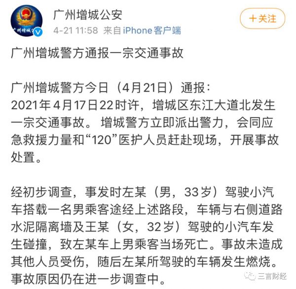 4月21日,广州增城警方也对此事作出通报,通报称4月17日晚上10时许,增城区新塘东江大道转卜蜂莲花路段发生一起交通事故,一辆特斯拉model3沿着东江大道开往新塘方向,突然失控先是撞到了道路右侧水泥隔离墙,然后又撞到路面上的另一辆小车,事故直接造成特斯拉车内一位男子当场身亡。