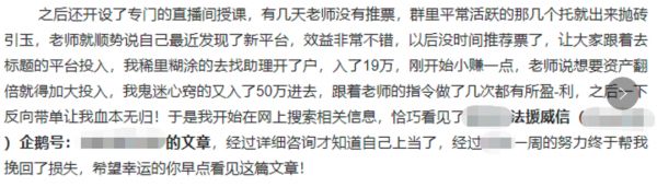 在文章开头以投资者的口吻控诉自己各种被骗,然后在xx法援的帮助下及时止损,追回了钱款。