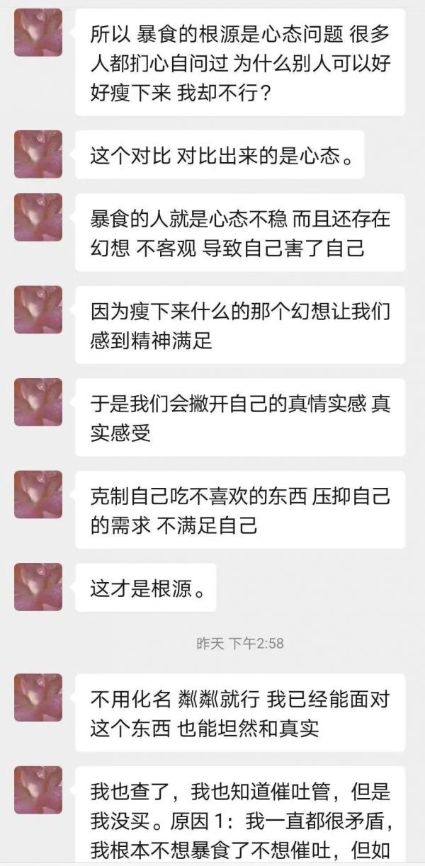 我上网和一些女生交流,找到了很多和我一样的人,我们有个可爱的名字叫“兔兔”(“吐”的谐音)。她们有和我一样徒手催吐的,有使用催吐管的,也有嚼吐的,很多人和我一样想走出来,却不知道路在哪。