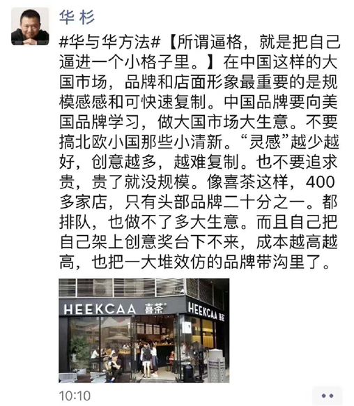 华与华创始人华杉曾在朋友圈点名喜茶,称其“即使做到400多家店,也只有头部品牌的二十分之一。即使都排队,也做不了多大生意。自己把自己架上创意奖台下不来,成本越搞越高,也把一大堆效仿的品牌带沟里了。”