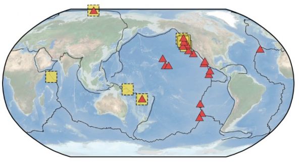 黄色正方形标注的是已在海底探测到的巨热流柱的位置 ,红色三角显示的探测到的深海火山灰。| 图片来源:Pegler et. al. / Nature Communications