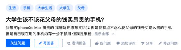 因自己对手机的需求和想法不被家长认可与接受,需要认同感的学生自然会把自己对手机的不满发到互联网和社交平台上。这也是我们会在知乎等平台看到「学生党该不该用XXX手机?」这种提问以及针锋相对的回答、评论的根本原因。购买手机的决策者和使用手机的用户对手机使用需求有相反的认知,因此他们需要在网上获得来自他人的认可。