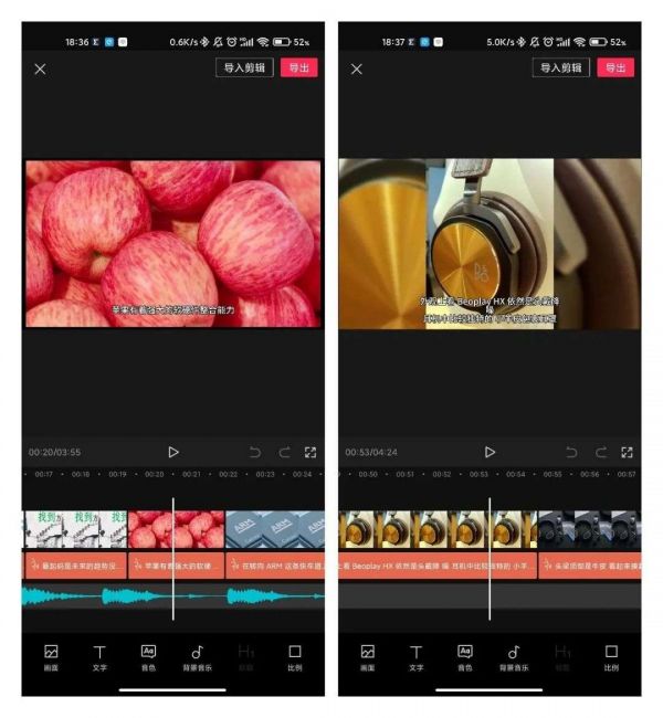 画面的话主要是静态图片,个别地方有动图、表情包。断句、卡点做得不错,但图片素材和文字内容的匹配度还有待加强。比如这里的苹果,根据整体内容应该不难判断出是指 Apple 公司。素材库的时效性也有待加强,一些新品评测的内容匹配的都是旧型号。