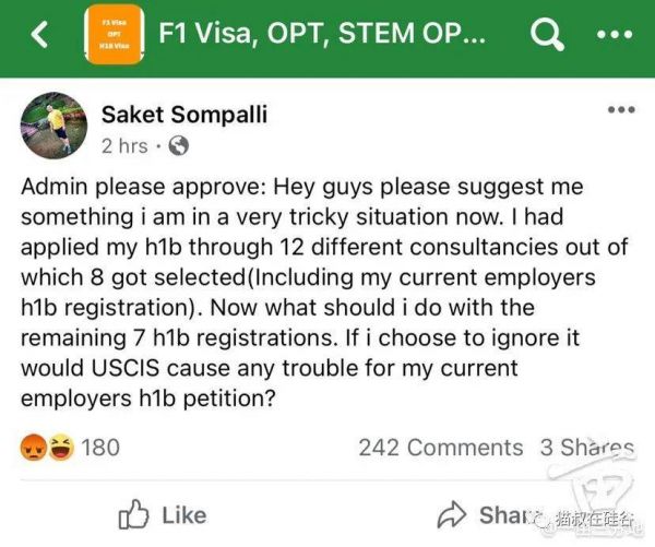 在Facebook一个关于H-1B的群组里,一位毕业于德州大学的印度软件工程师Saket Sompalli宣称自己通过外包公司提交了12份签证申请,结果有8个申请都中签了,现在他发愁自己应该选择哪家公司。这个有意无意的炫耀帖子顿时引发了中国留学生们的公愤。这个帖子在发布了25天之后,目前依然存在。