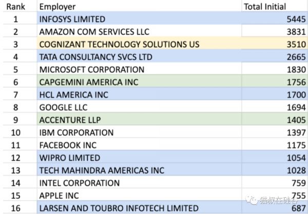 如果从提交申请数量来看,每年申请H-1B签证最多的企业不是美国的科技巨头,而是Infosys、Tata这样的印度外包巨头。外包公司Infosys那年获得的H-1B签证超过3500张,甚至比微软和谷歌加起来还多,更是Facebook的三倍。