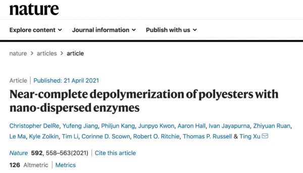 相关论文 “Near-complete depolymerization of polyesters with nano-dispersed enzymes” 为题,发表在 Nature 杂志上。