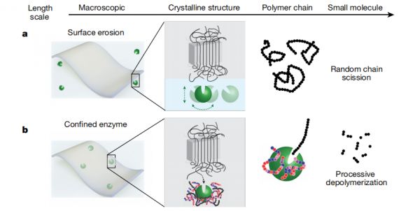 图 | (a) 在塑料表面直接嵌入酶会形成断链,降解速度缓慢;(b)以 RHP 包裹酶,酶在纳米范围内被限制在与聚合物链端的位置,降解效果显著提升。