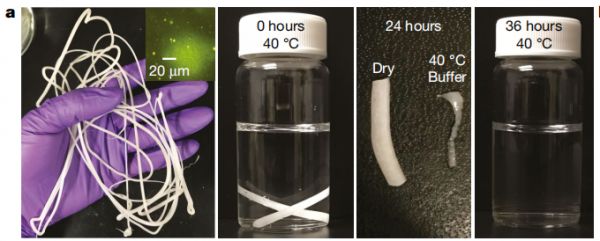图|嵌入脂肪酶的 PCL 塑料段,在 40℃条件下浸泡于水中,24 小时后可以明显看出降解情况,36 小时内降解为小分子,瓶中已看不出塑料踪迹,接近完全转化。(来源:论文)