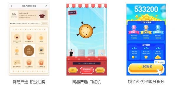 来看一些产品中的案例:网易严选的抽奖直接有效,用积分换区抽奖机会;而口红机是游戏化的玩法提升用户的参与度,也是消耗用户积分;饿了么的打卡瓜分让用户投入积分下注,打卡瓜分,兼顾积分消耗和用户活跃。