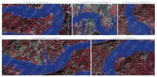 2020年7到8 月,长江、嘉陵江、乌江干支流等多条河流出现超警戒、超保证水位洪水。针对重庆地区水患,佳格天地联合中再巨灾管理公司,结合卫星遥感监测及“高绘”AI 算法,对当地建筑物分布进行了识别及提取。所有工作在一天之内完成,时效性远超人工。