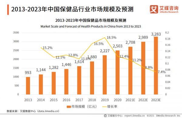 iiMedia Research (艾媒咨询)在《艾媒咨询|2021Q1中国保健品及NMN市场研究报告》中指出,数据显示,2013-2020年中国保健品市场规模持续增长,自2017年起市场规模增速加快,预计到2021年中国保健品市场规模增至2708亿元。