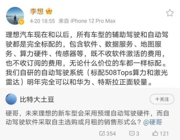 另一个没有亲赴上海车展现场的理想汽车CEO李想则在社交媒体平台,面对网友提问时发表观点表示:“我们自研的自动驾驶系统(标配 508Tops 算力和激光雷达)明年完全可以和华为、特斯拉正面较量。”