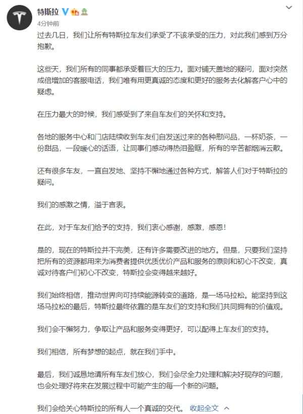 @每日经济新闻【特斯拉:我们会尽全力处理和解决好现存的问题】昨日夜里,特斯拉官方微博再发声明:我们诚恳地请所有车友们放心,我们会尽全力处理和解决好现存的问题,也会处理好将来在发展过程中可能产生的每一个新的问题。 我们会给关心特斯拉的所有人一个真诚的交代。