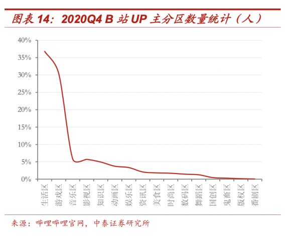 中泰证券研究所数据显示,2020 年 Q4,B 站影视区 UP 主数量位列第四,仅次于生活区、游戏区和音乐区;同时,按投稿数量来分,影视区的稿件数量也位居第四,仅次于游戏区、生活区和知识区。