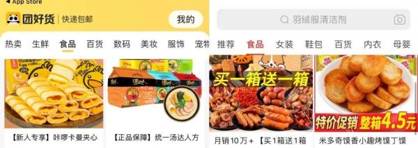 相比较于其他三项业务,团好货在电商组合拳中算是年纪最小、最低调的那一个,在模式上,它完全对标拼多多——打开两个产品的界面,无论是商品品类还是价格,你甚至很难找出一眼即可分辨出的明显差异。