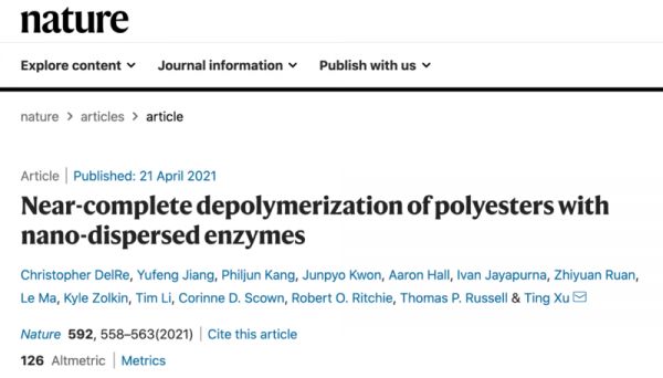 相关论文“Near-complete depolymerization of polyesters with nano-dispersed enzymes” 为题,发表在 Nature 杂志上。