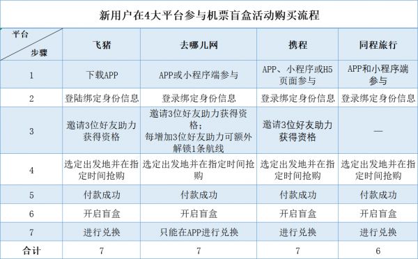 如果作为新手用户,分别要在飞猪、去哪儿网、携程和同程旅行4大平台上参与机票盲盒活动,整体流程操作步骤除同程旅行是6步以外,其余3家均需要7步,整体对比来看,同程旅行的机票盲盒玩法相对简单。