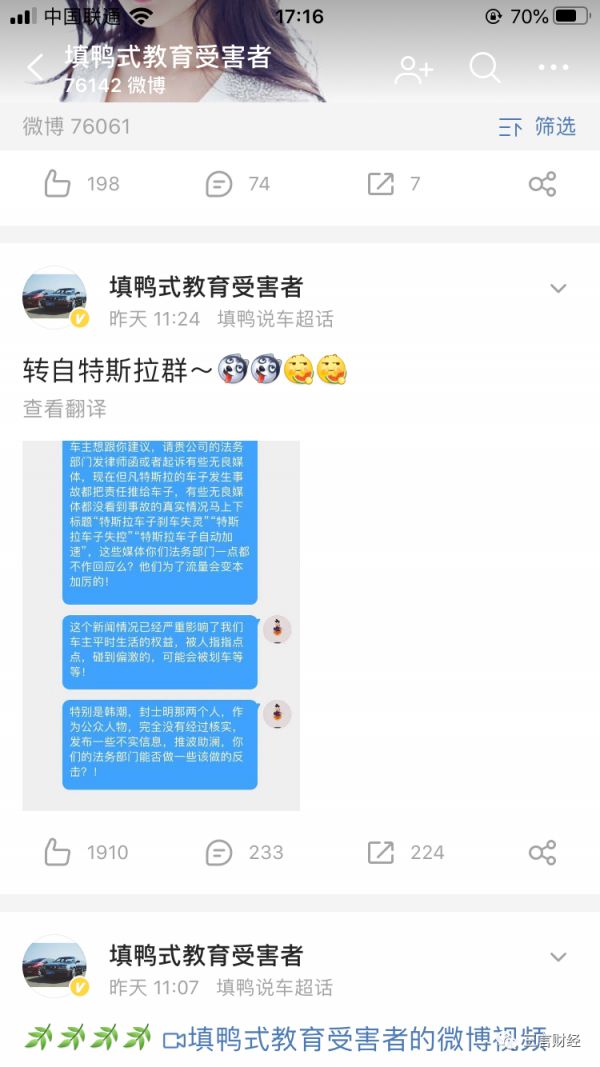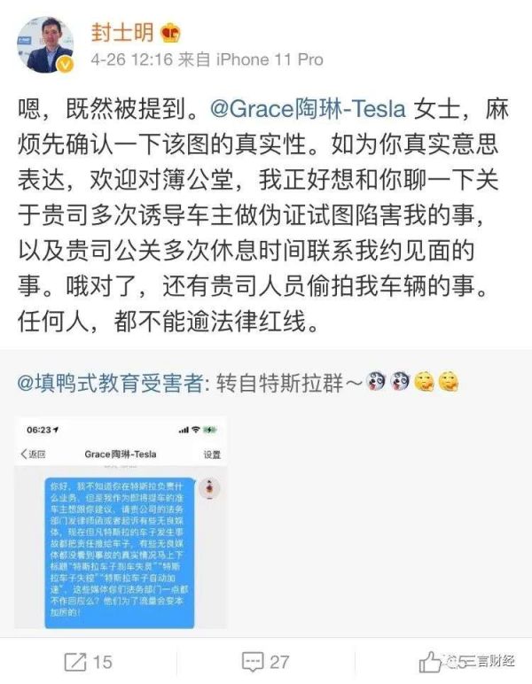 昨天,封士明转发了填鸭式教育受害者的微博并@陶琳。称想和陶琳聊一下特斯拉多次诱导车主做伪证试图陷害他,以及特斯拉公关多次休息时间联系他约他见面,还有特斯拉人员偷拍他的车辆的事。