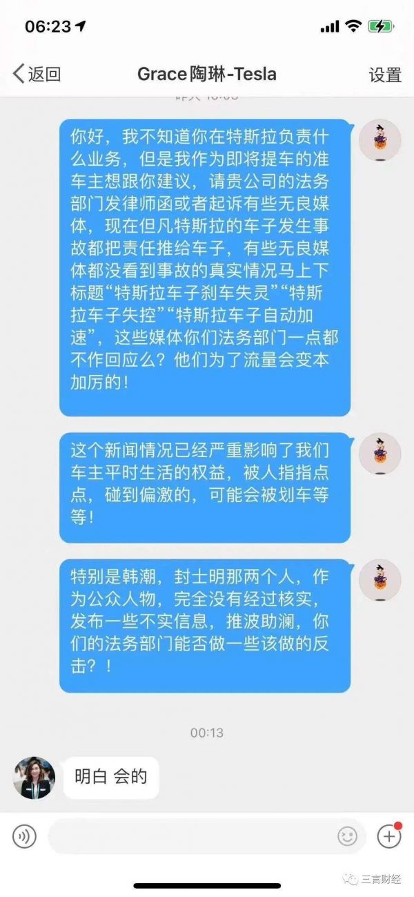 昨天,汽车博主填鸭式教育受害者在微博上发布了一张转自特斯拉群的微博私信截图。图片中显示的是一位自称即将提车的准车主发给特斯拉副总裁陶琳的消息,消息中请特斯拉公司法务部门发律师函或者起诉一些媒体,最后还强调了韩潮和封士明两个人,问陶琳法务部门能不能做一些反击。