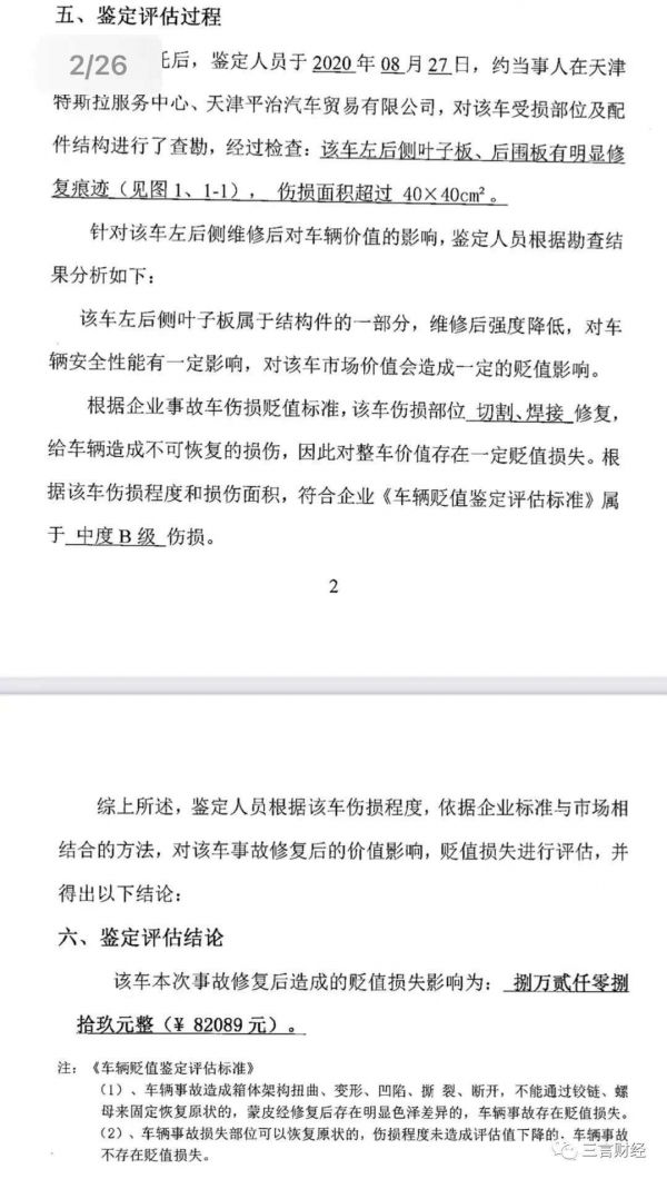 由于特拉斯不认可韩潮单方面提供的《技术鉴定意见书》。经法院组织,双方同意由北京晶实机动车鉴定评估机构有限公司对涉案车辆进行司法鉴定。最终,鉴定意见为,“该车本次事故维修后造成的贬值损失影响为82089元” “该车后叶子板维修后会对车辆安全性造成一定影响。”