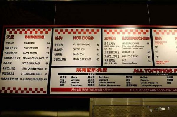 从菜单来看,Five Guys的菜单几乎与其在美国市场无异,汉堡价格在40元至85元不等,经典双层芝士汉堡售价70元,所有的汉堡配料则是免费的——包括各种酱料、烤蘑菇、烤洋葱、墨西哥辣椒等等。薯条则在30元上下。Five Guys在美国的汉堡价格也在7美元上下,价位略高于诸如In-n-Out等其他汉堡品牌。