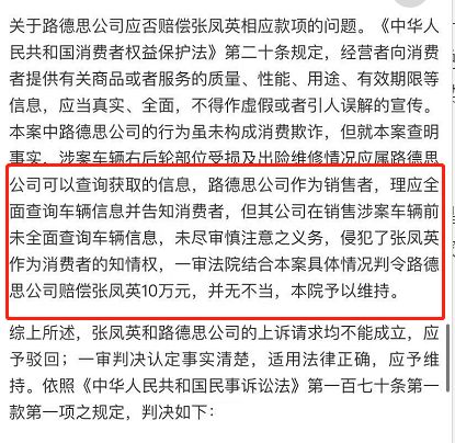 第一个是,特斯拉说是展车,从来没有出现过事故,连喷漆都没有喷过。然后车主后期发现这车出过事故,出事故的时候车辆还是在特斯拉名下,一审二审最后判决侵犯了知情权,特斯拉赔了10万。