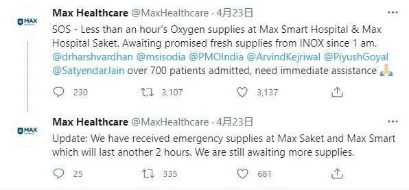 就连医院的医用氧气面临断供,也要通过推特来发送SOS。/ Twitter@MaxHealthcare