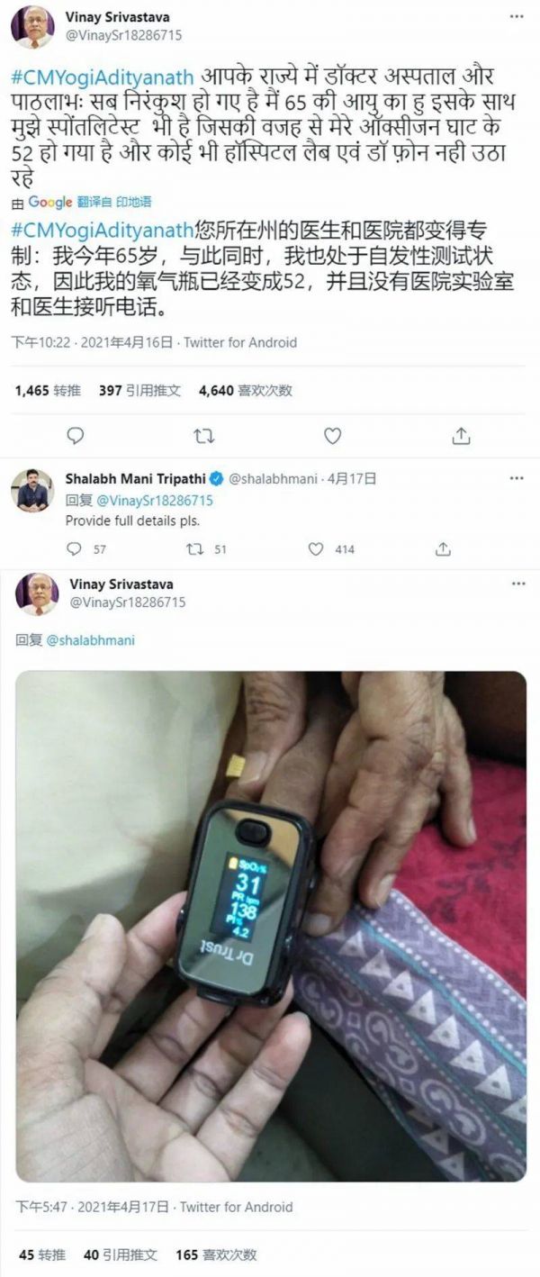 “我今年65岁,再加上我得了脊柱炎,我的血氧量降到了52%。”4月23日,印度北方邦勒克瑙的自由记者维奈·斯利瓦斯塔瓦(Vinay Srivastava)用印地语发了一条推特。“我做了核酸检测,但没有医院和医生拿起电话(接受我的求助)……”