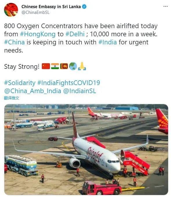 800台制氧机已经从中国香港空运至德里,之后还有1万台机器陆续运往印度。/ Twitter @ChinaEmbSL(中国驻斯里兰卡大使馆推特账号)