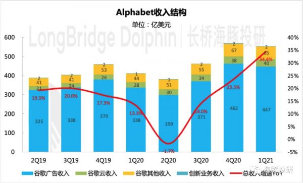 正如海豚君的前瞻中预期,Google广告业务复苏力度超出市场预期,实现收入447亿美元,同比增速达34%,结合搜索广告、联盟广告去年低基数,本期增速继续创新高。