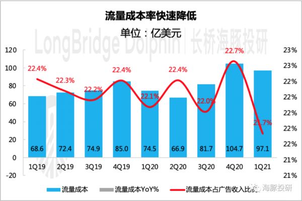 一方面,成本端得到大幅改善。主要贡献来自于高收入增长下,流量成本率的降低。从流量成本占谷歌广告收入比来看,一季度的流量成本率近两年以来首次滑落至22%以下。