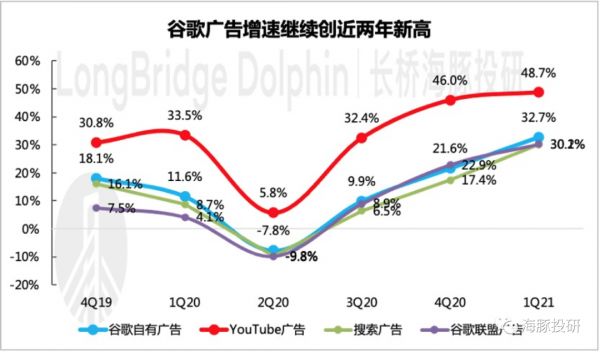 尤其是广告业务,复苏力度超预期强劲,而YouTube则在基数不低的情况下增长再一次加速。