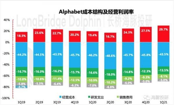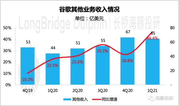 在其他收入中,主要由Google Play、YouTube和硬件Fitbit(上季度完成收购)贡献带来。受益线上娱乐以及流媒体潮流趋势,一季度其他收入大幅增长46%。