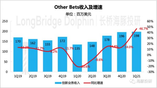 海豚君在谷歌前瞻中提到,一直以来谷歌的创新业务更多承担的是前沿技术的种子孵化角色,公司短中期内对业绩贡献的诉求不高。一季度创新业务稳步增长,实现营收1.98亿美金,同比增长47%,增速显著加快。