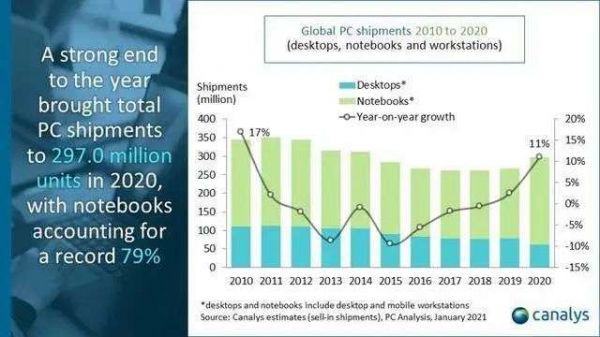 根据Canalys数据来看,2020年全球PC接近3亿的出货量中,有八成都是笔记本,而台式机的占比仍在逐年下降,从10年前的三分之一跌至如今的不到五分之一。